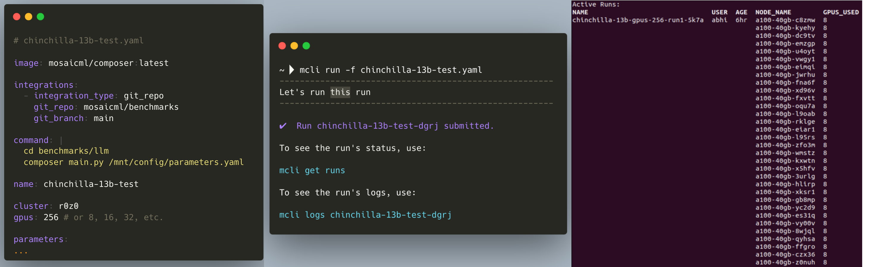 First, MosaicML Cloud provides a job scheduler that works on any cluster (yours, ours, or a cloud provider’s) and makes launching and scaling jobs feel like magic. Accelerating a workload is as easy as changing `gpus: 8` to `gpus: 256`; MosaicML Cloud and our Composer library take care of all the distributed training details. In Figure 3, you can see what it looks like when we launch a GPT-13B training run from our laptop and monitor our cluster (that’s a single run on 256 GPUs!). As we demonstrated in Part 1 of our LLM series, multi-node training with the right infrastructure incurs very little overhead: on MosaicML Cloud we see near linear scaling when training LLMs on up to hundreds of GPUs. That means you get your work done a lot faster, with minimal increase in total cost.