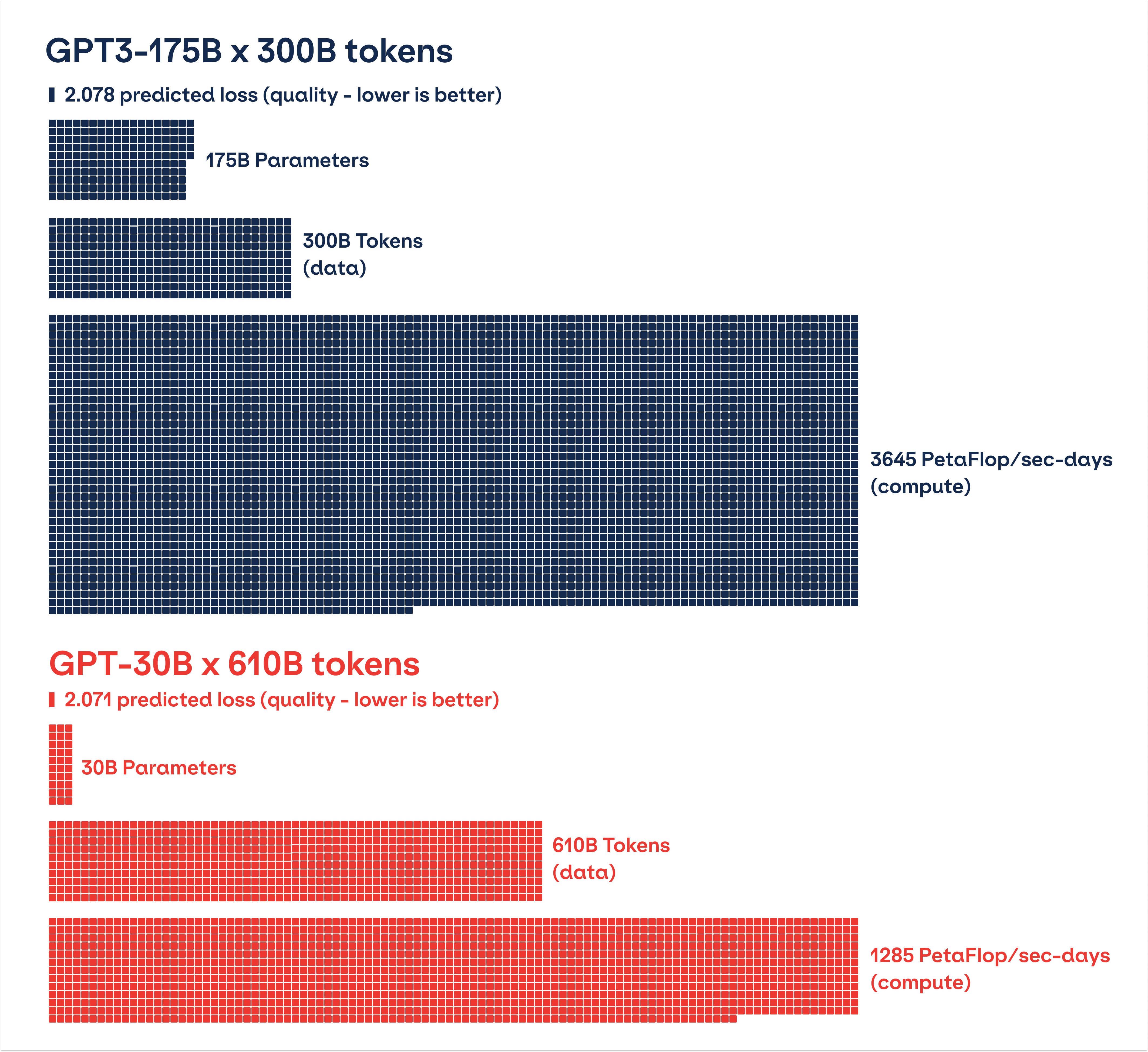 We used the same scaling law and plugged in the original GPT3-175B recipe of (N=175e9, D=300e9) to get a predicted loss value of L = 2.078. If we instead follow the recommendations from the paper by scaling data proportionally with model size (approx. D = 20 * N), and keep hardware-efficient layer sizes in mind, then we arrive at a GPT-30B model and recipe (N=30e9, D=610e9) that is predicted to have a slightly lower loss value of L = 2.071. This new recipe uses 65% less compute than before (See Figure 6), leading to a huge reduction in training time and cost!